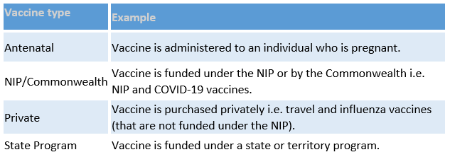 NOTE: Where an individual is pregnant, providers should report the ‘Antenatal’ option in the first instance, regardless of whether the vaccine is funded privately or under a Commonwealth/state program.