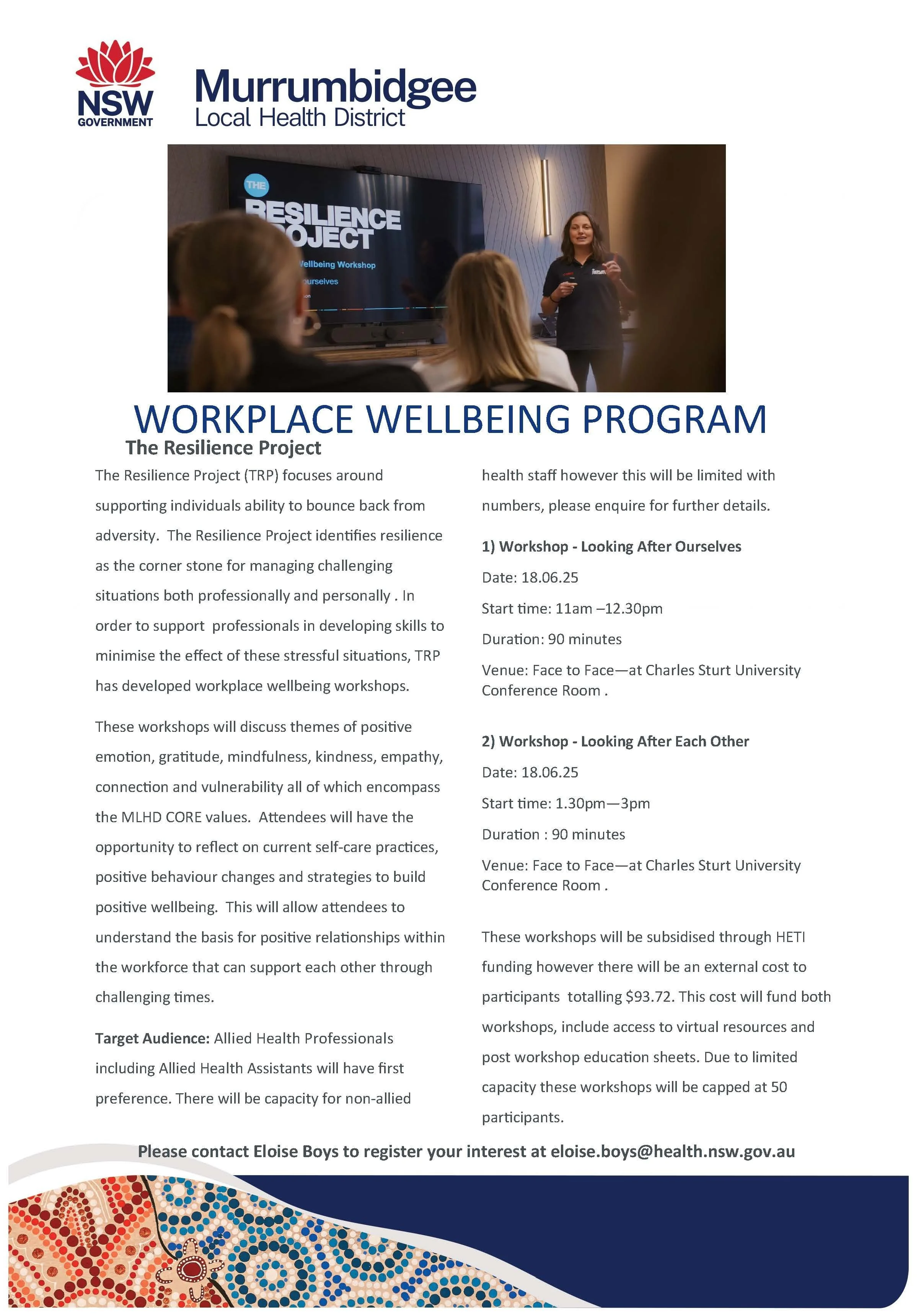 MLHD: Workplace Wellbeing Program Wednesday 18 June 2025 11:00 am 3:00 pm Charles Sturt University Wagga Wagga (map) Google Calendar ICS