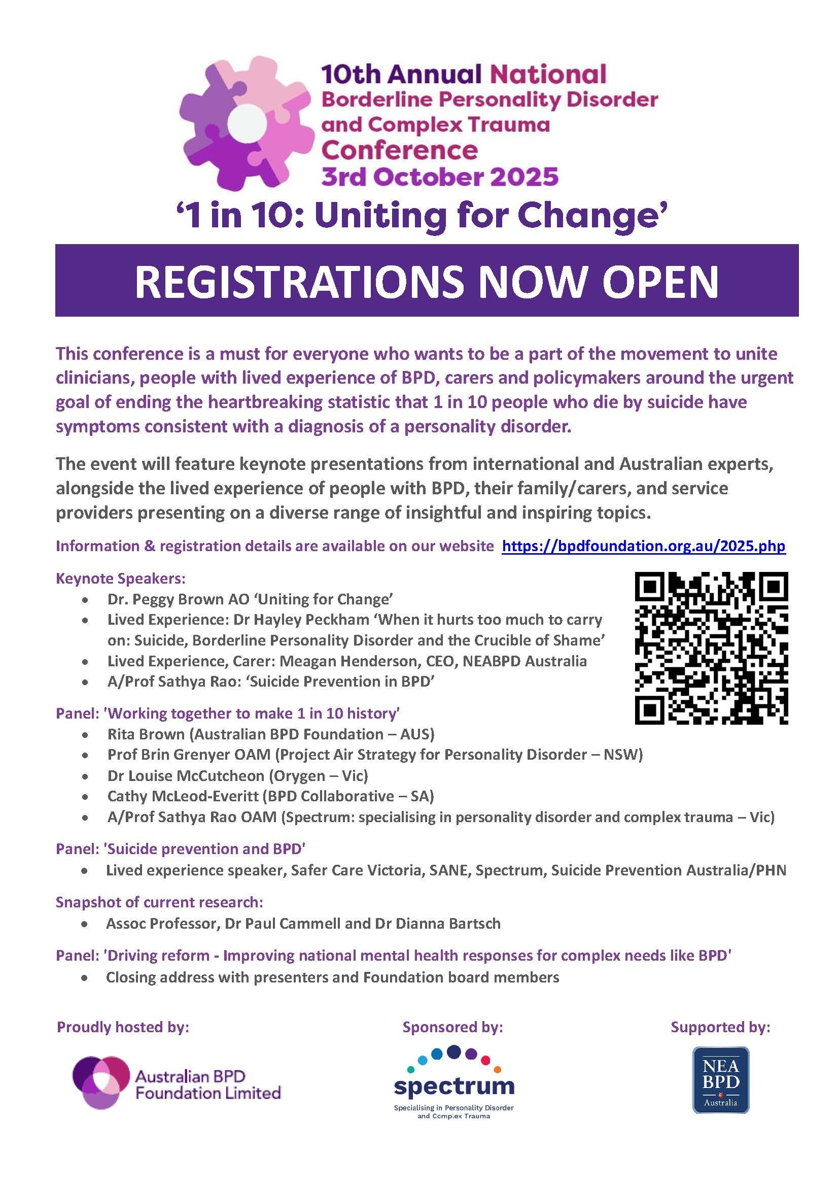 10th Annual National Borderline Personality Disorder and Complex Trauma Conference Friday 3 October 2025 9:00 am 5:00 pm Melbourne / online (map) Google Calendar ICS
