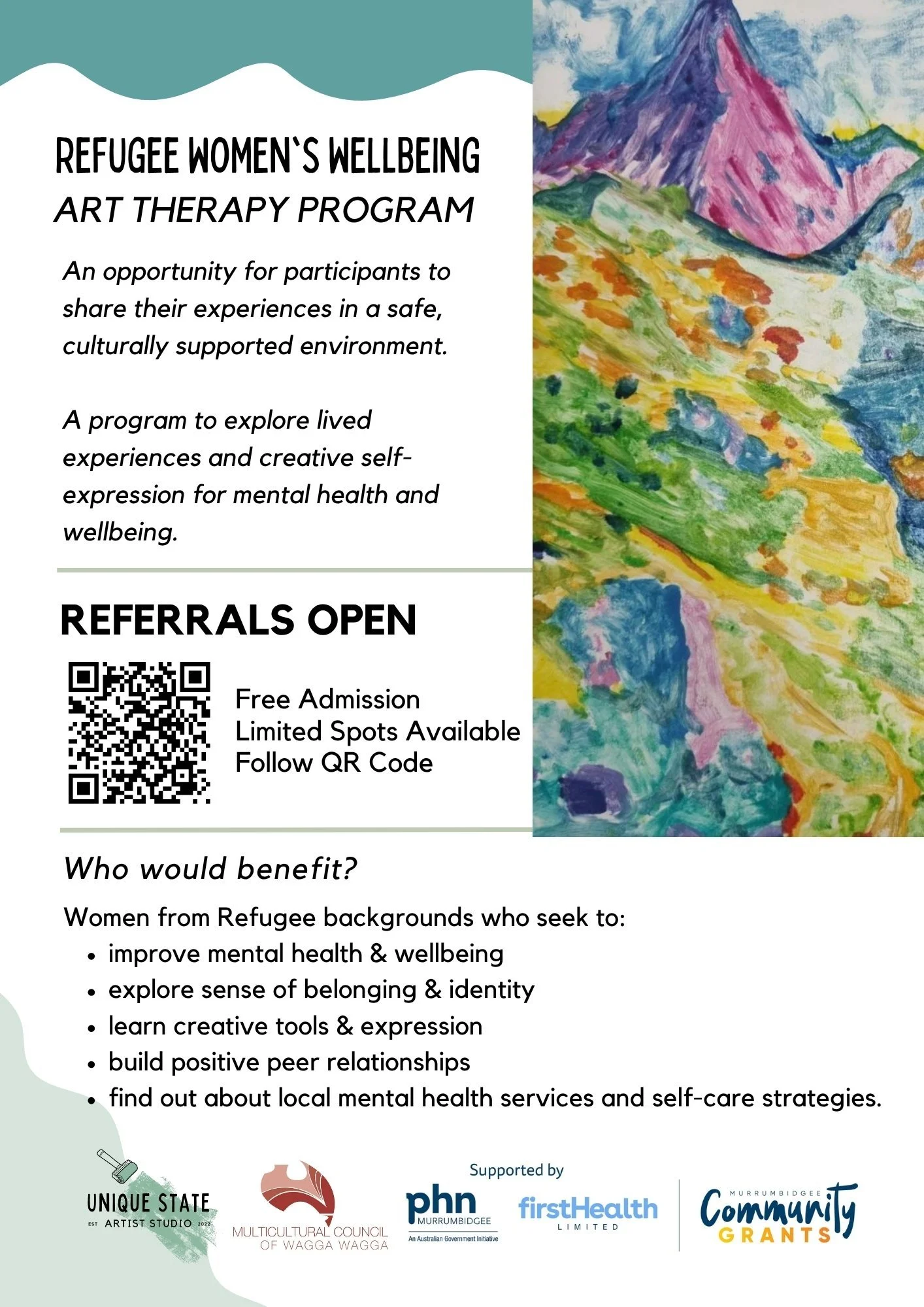The Multicultural Council of Wagga Wagga will deliver a series of art therapy groups for women from refugee backgrounds, hosted at UNIQUE Art space in Wagga Wagga.