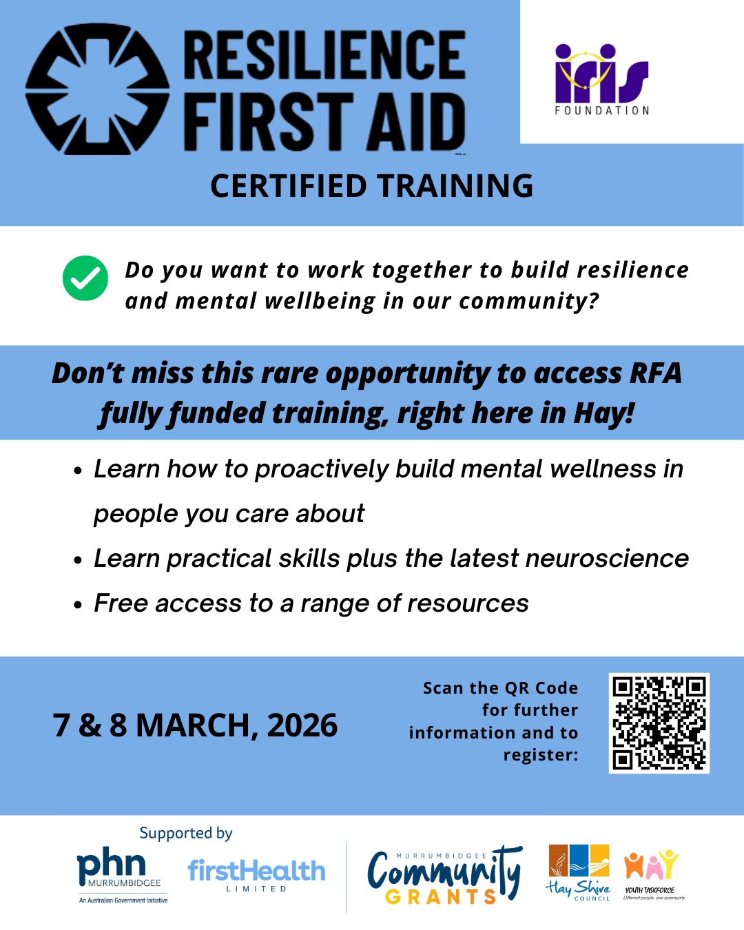 This will be followed by Resilience First Aid (RFA) training, delivered face-to-face in Hay over two full days for up to 20 participants. This accredited training develops deeper skills to recognise distress, respond early and provide appropriate support, while strengthening community connection and confidence.