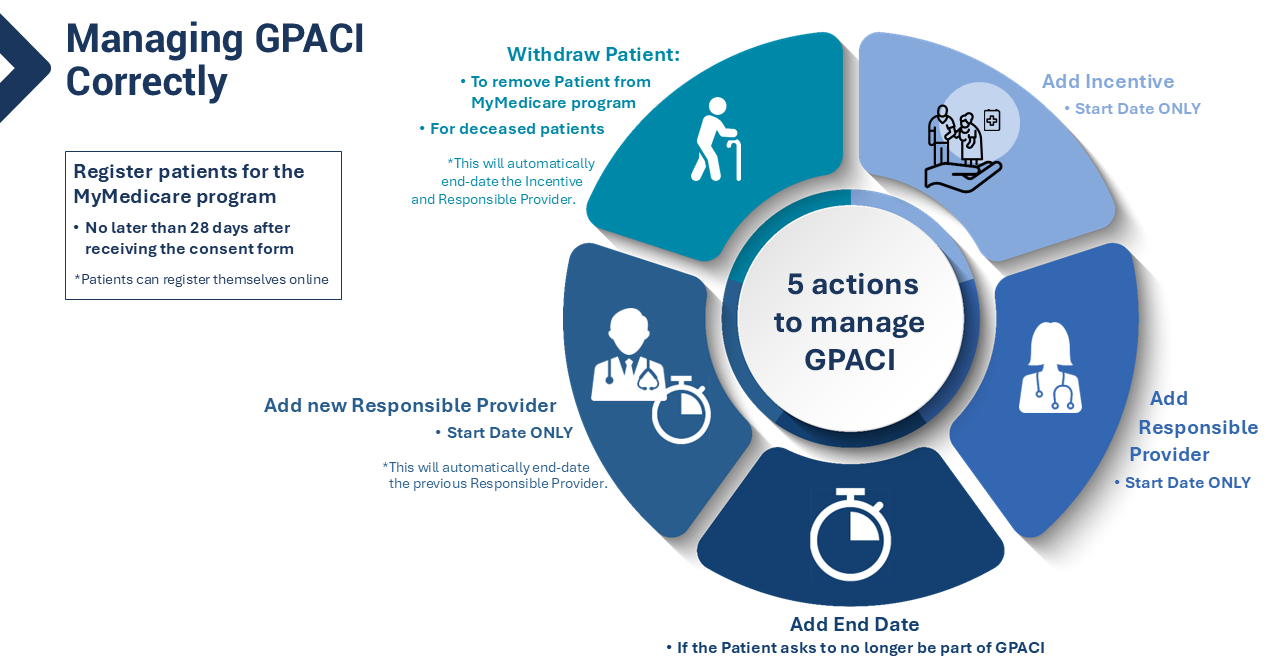 DO NOT Delete GPACI from a patient’s MyMedicare profile unless the Incentive was added in error. If the patient is deceased, withdraw them from MyMedicare but do not delete the Incentive.