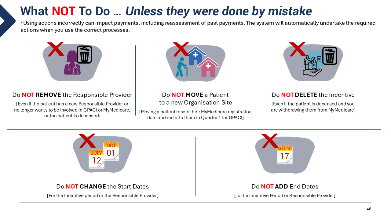 DO NOT Move a patient to a new Organisation Site unless you understand the impact to payments. Moving a patient resets their MyMedicare registration date and restarts them in Quarter 1 for GPACI.