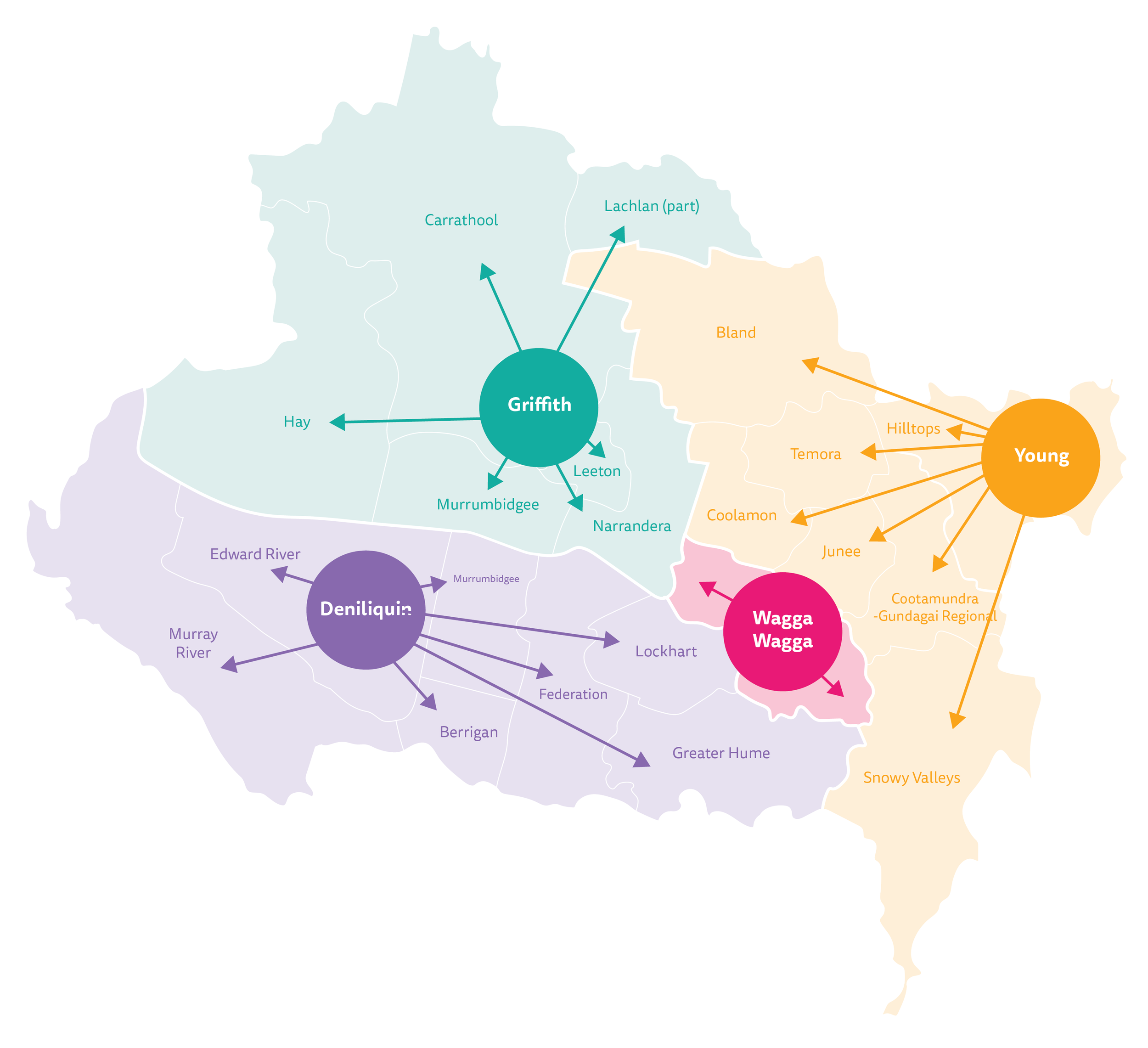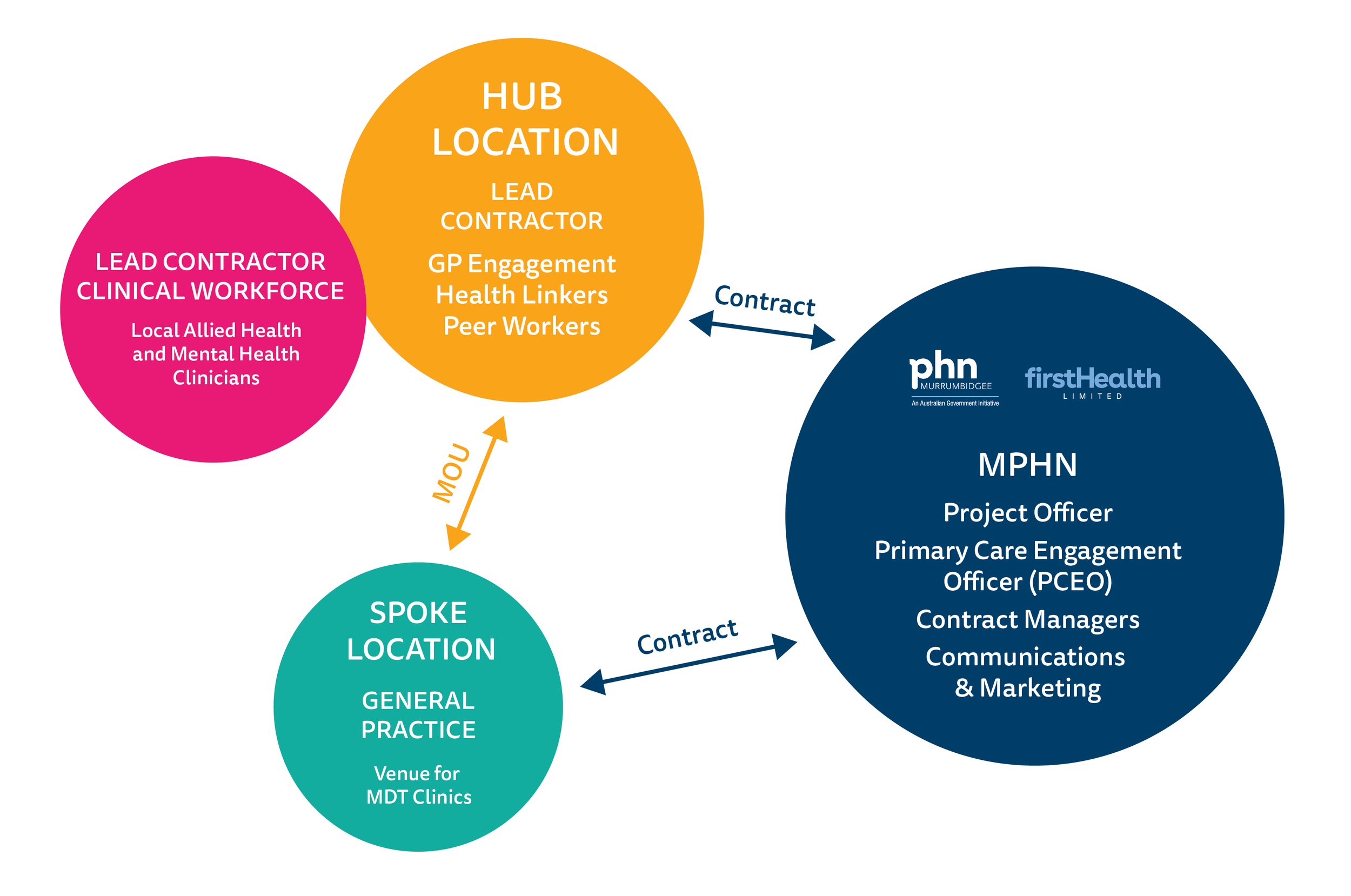 Hubs are to belocated in Wagga Wagga, Young, Griffith and Deniliquin and will be established by the Lead Contractor(s). Hubs will act as service bases and will administer and deliver Better. Together. MDT services into at least one General Practice in every Local Government Area (LGA). Hubs will be staffed by non-clinical roles and will engage (employ or subcontract) a range of local Mental Health and Allied health clinicians.