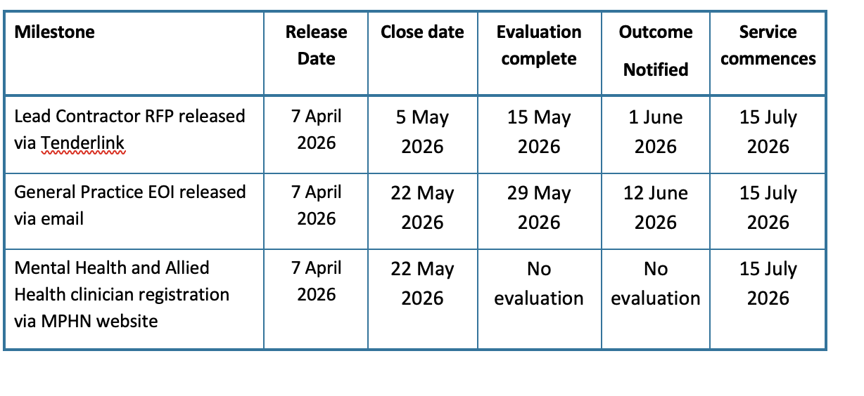 Lead Contractor (s) will be engaged by MPHN via an open and competitive Request for Proposal (RFP), for activity to June 2028. Organisations may propose to act as the Lead Contractor for a consortium or network of private providers and/or to offer Lead Contractor services across one, some or all hub locations.